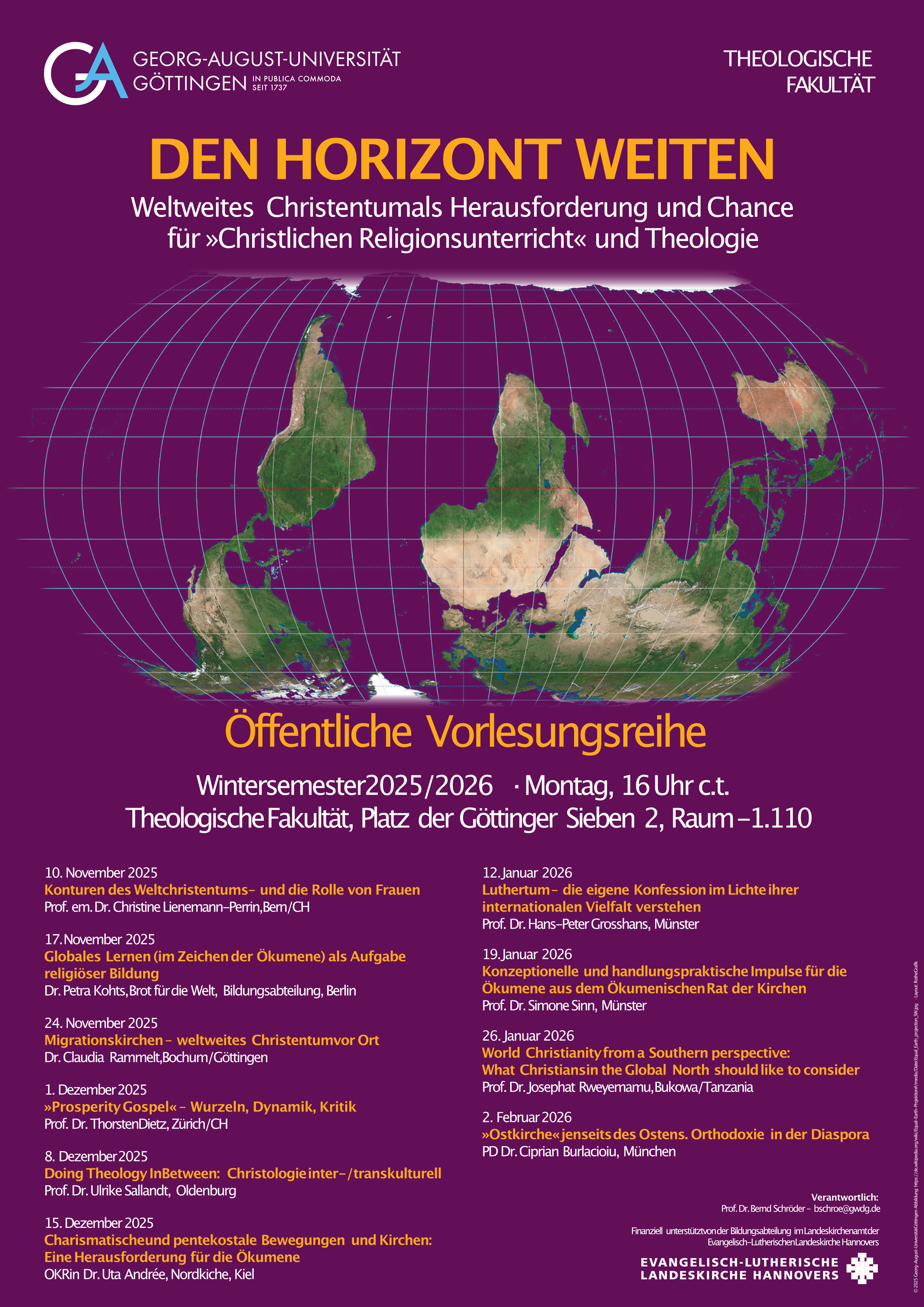 Die Vorlesungsreihe wird veranstaltet vom Lehrstuhl für Praktische Theologie mit Schwerpunkt Religionspädagogik von Prof. Dr. Bernd Schröder.